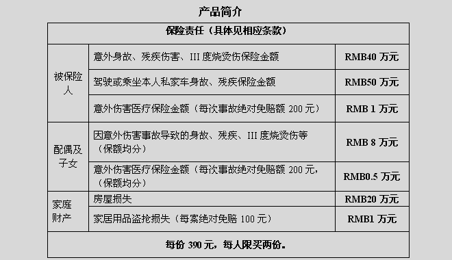 “财智家和”的保障涵盖被保险人及配偶子女的意外身故、伤残及家庭财产保险,可谓“一张保单、全家保险”;产品中“驾驶或乘坐本人私家车身故、残疾保险金额”达50万元,保证您“一单在手、出行无忧”。