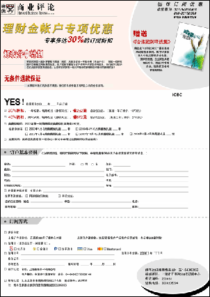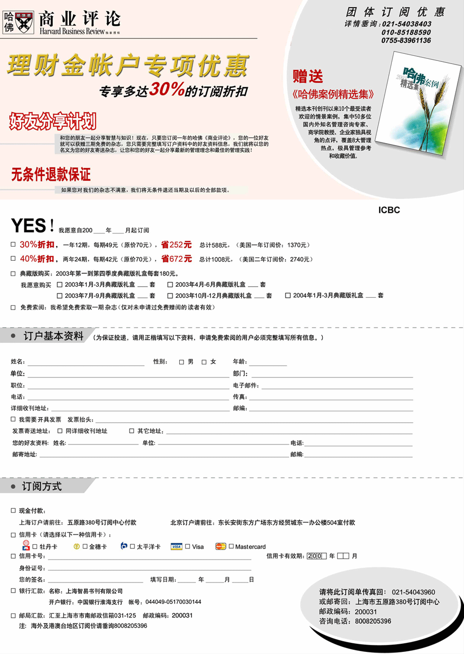 即日起,理财金账户客户订阅杂志一年共12期可享受多达30%的折扣,订阅两年共24期更可获得40%的折扣。订阅一年即可获赠《哈佛案例精选集》一本,囊括该刊物创刊以来10个最受读者欢迎的情景案例;此外,您的朋友还可获赠三期免费的杂志!